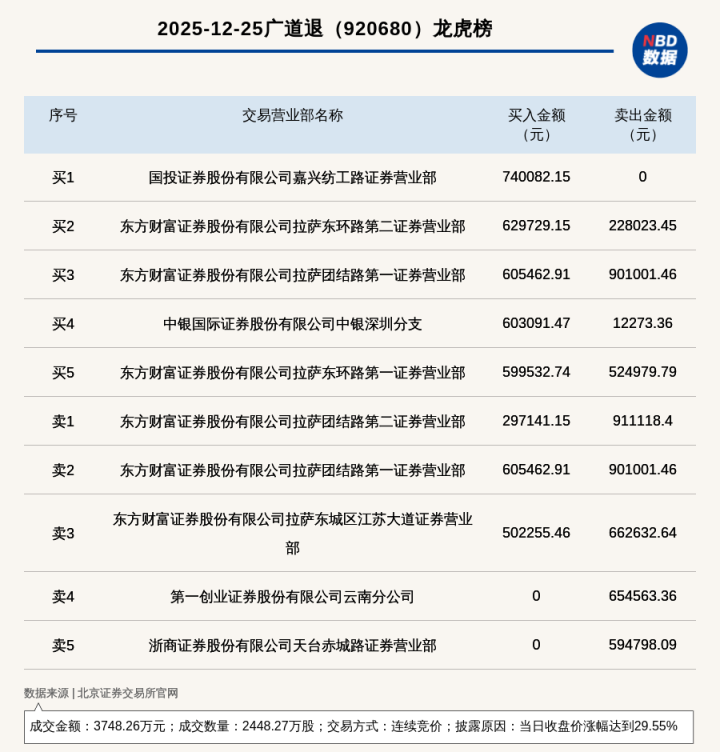 每经讯,2025年12月25日,北交所上市公司广道退(920680,收盘价:1.71元)登上龙虎榜,交易方式是连续竞价,披露原因是当日收盘价涨幅达到29.55%,成交数量2448.27万股,成交金额3748.26万元。买一席位为国投证券股份有限公司嘉兴纺工路证券营业部,买入74.01万元;卖一席位为东方财富证券股份有限公司拉萨团结路第二证券营业部,卖出91.11万元。